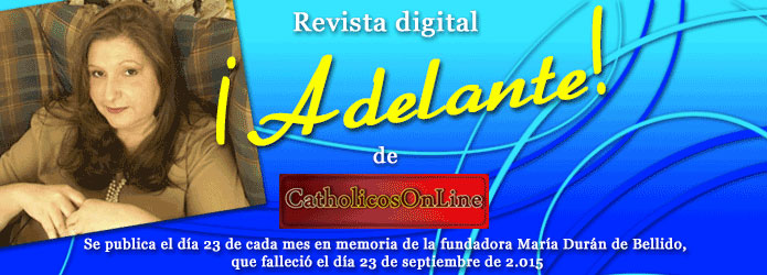 Querido amigo de CatholicosOnline; con gran alegría te damos la bienvenida a nuestra revista “¡Adelante!”, la revista que inauguramos hoy, 23 de Febrero de 2.016, y que el día 23 de cada mes va a ser publicada y enviada a nuestros amigos y suscriptores, en honor y memoria de María Durán de Bellido, Fundadora y Presidente de CatholicosOnLine, que pasó a la Casa del Padre, el pasado 23 de Septiembre de 2.015.